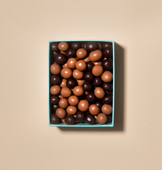 Noisettes du Piémont torréfies et enrobées de chocolat noir 62% ou de notre chocolat au lait vegan »brun » 42%.