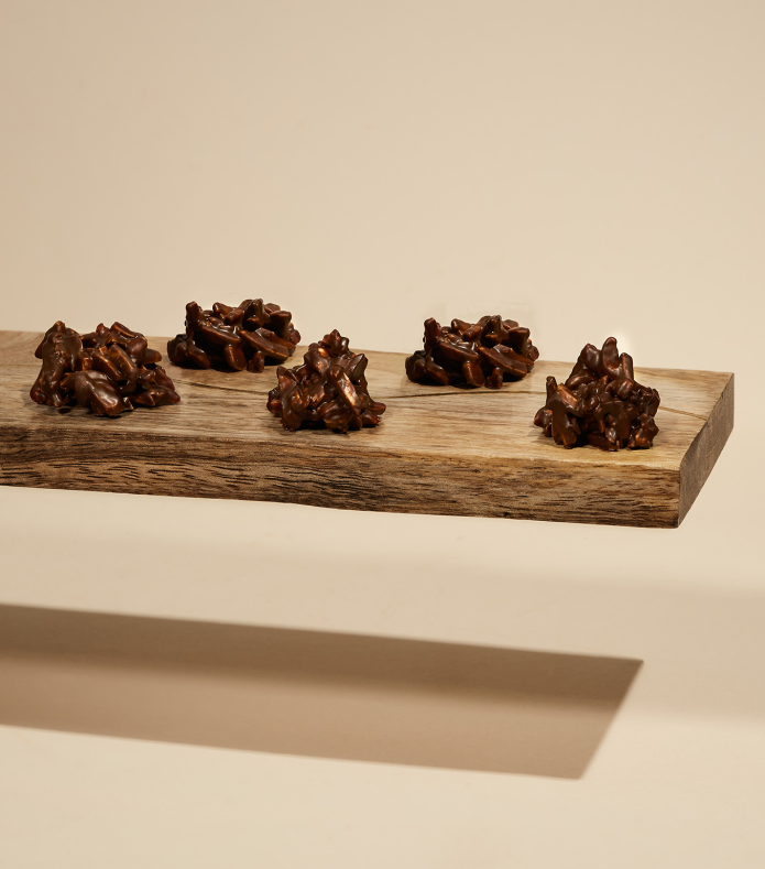 חטיף גולמי, מקלות שקדים קלויים מעורבבים עם שוקולד מריר בנשיכות קטנות ולא סדירות, גם פריכות וגם טעימות.